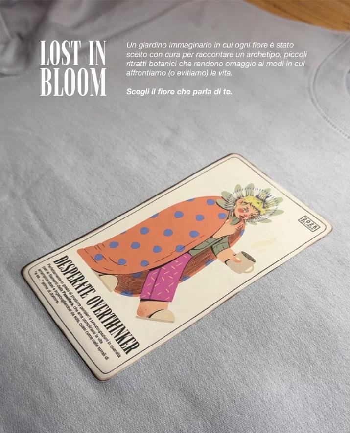 Nel progetto felpe Lost in Bloom questo concetto passa attraverso i fiori. A ogni personalità è associata una specie con caratteristiche botaniche che ne rispecchiano il temperamento, raccontate attraverso piccole card descrittive.
